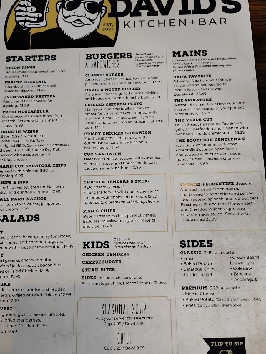 The menu at David's Kitchen & Bar in Cincinnati feels like a well-rounded showcase of comfort food, modern flavors, and a strong drink program. Starters like Onion Rings, Shrimp Cocktail, and Fried Mozzarella are inviting choices that make it easy to share or kick off a meal with something indulgent. Salad lovers will appreciate fresh options such as the BLT, City, Caesar, and Harvest, each bringing a different balance of crisp textures and hearty toppings. The Classic Burger and David's House Burger headline the Burgers & Sandwiches section, but the Grilled Chicken Pesto, Crispy Chicken Sandwich, and Cod Sandwich show that variety isn’t lacking. Families will notice thoughtful Kids selections like Chicken Tenders, Cheeseburger, and Steak Bites, making it a place that feels inclusive for all ages.