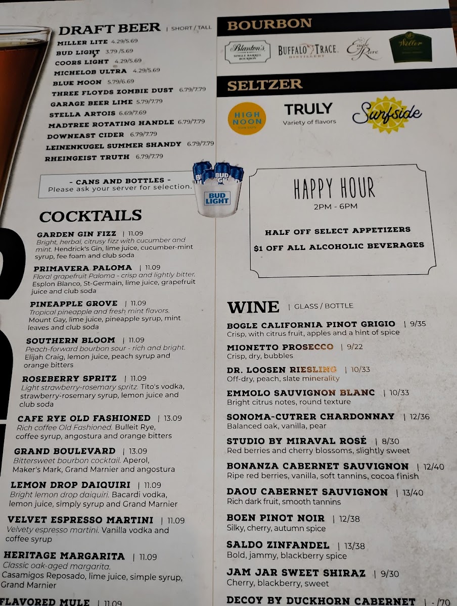 The main courses stand out with house specialties such as Dad's Favorite, The Signature, and The Verde Cut, while dishes like The Southern Gentleman and Salmon Florentine bring flair to the lineup, offering a balance between hearty classics and lighter, flavorful plates. Drinks are equally appealing, whether it’s a familiar Miller Lite, Bud Light, or Blue Moon on draft, or creative cocktails like the Garden Gin Fizz, Primavera Paloma, and Roseberry Spritz that feel crafted with care. For wine enthusiasts, bottles such as Bogle California Pinot Grigio, Mionetto Prosecco, and Sonoma-Cutrer Chardonnay highlight a thoughtful selection that pairs well across the menu.